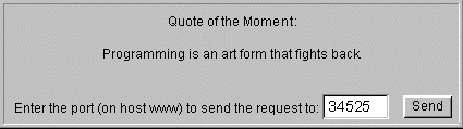 Before the applet can get quotes, you need to run the server on the host that the applet came from. You then need to note the number of the port that the server is listening on. After you enter this port number into the applet, it will hook up with the server and you'll be able to get one-line quotations. Below are detailed instructions, followed by pictures of the server and the applet in action.