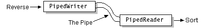 The reverse method starts a ReverseThread(in a .java source file) that writes its output to the PipedWriter and then returns the PipedReader to the caller. The caller then arranges for a sorting thread to read from it. The sort method is exactly the same, except that it creates and starts a SortThread(in a .java source file).