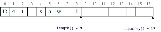 Methods used to obtain information about an object are known as accessor methods. One accessor method that you can use with both strings and string buffers is thelengthmethod, which returns the number of characters contained in the string or the string buffer. After the following two lines of code have been executed,lenequals 17:In addition toString palindrome = "Dot saw I was Tod"; int len = palindrome.length();length, theStringBufferclass has a method calledcapacity, which returns the amount of space allocated for the string buffer rather than the amount of space used. For example, the capacity of the string buffer referred to bydestin theStringsDemoprogram never changes, although its length increases by 1 for each iteration of the loop. The following figure shows the capacity and the length ofdestafter nine characters have been appended to it.A string buffer's length is the number of characters it contains; a string buffer's capacity is the number of character spaces that have been allocated. The Stringclass doesn't have acapacitymethod, because a string cannot change.Getting Characters by Index from a String or a String Buffer