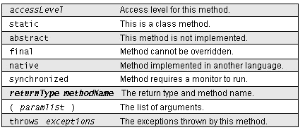 A method's declaration provides a lot of information about the method to the compiler, to the runtime system, and to other classes and objects. Included is not only the name of the method, but also such information as the return type of the method, the number and type of the arguments required by the method, and which other classes and objects can call the method.
