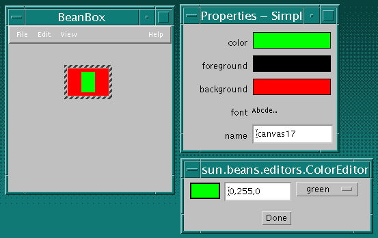 Colorproperty. The introspection mechanism will also search for aColorproperty editor. AColorproperty editor is one of the default editors supplied with the BeanBox, and is assigned asSimpleBean'sColorproperty editor. Click on theColorproperty in the Properties sheet to run this editor. Section 9.2 of the JavaBeans API Specificationdiscusses property editors.
