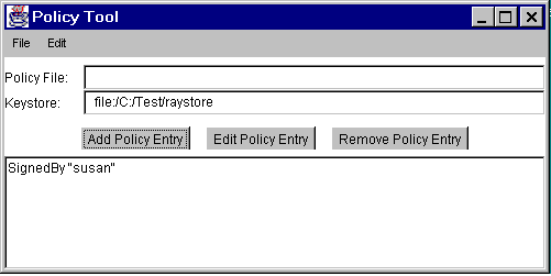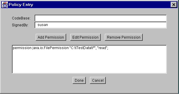 To grant code signed bysusanpermission to read any files in theC:\TestDatadirectory, you need to create a policy entry granting this permission. Note that "Code signed bysusan" is an abbreviated way of saying "Code in a class file contained in a JAR file, where the JAR file was signed using the private key corresponding to the public key that appears in a keystore certificate in an entry aliased bysusan."Choose the Add Policy Entry button in the main Policy Tool window. This brings up the Policy Entry dialog box: