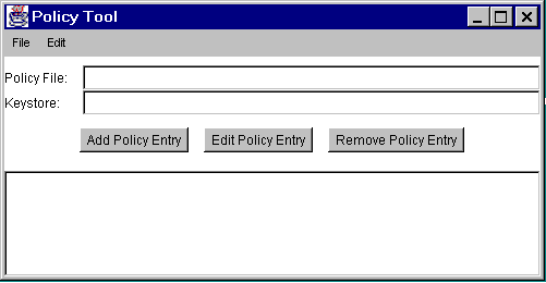 The first time you run the Policy Tool, you will see the blank Policy Tool window, since a user policy file does not yet exist. You can immediately proceed to create a new policy file, as described in the next step.