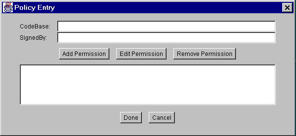 Click the image to view it at its natural size.You are now done specifying this policy entry, so choose the Done button in the Policy Entry dialog. The Policy Tool window now contains a line representing the policy entry, showing the CodeBase value.