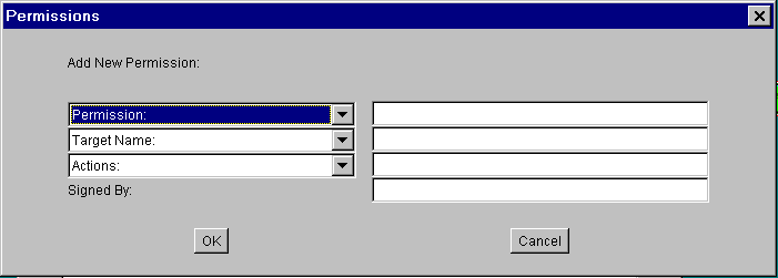 Note: If you wanted to grant the permission to any code (.classfile) not just from the directory specified previously but from thesecurity1.2directory and its subdirectories, you'd type the following URL into the CodeBase box:http://java.sun.com/docs/books/tutorial/security1.2/-You've specified where the code comes from (the CodeBase), and that the code does not have to be signed (since there's no SignedBy value). Now you are ready to grant permissions to that code.