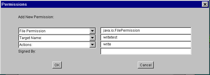 java.io.FilePermission) now appears in the text box to the right of the drop-down list.