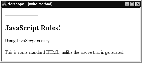 <HR ALIGN="left" WIDTH=25%>write has a companion method, writeln, which adds a newline sequence (a carriage return or a carriage return and linefeed, depending on the platform) at the end of its output. Because HTML generally ignores newlines, there is no difference between write and writeln except inside tags such as PRE, which respect carriage returns.